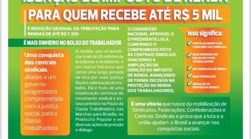A avaliação das organizações é de que a ampliação da isenção do Imposto de Renda representa uma vitória do movimento sindical aliado a um governo de perfil progressista, com foco na valorização do trabalho e na redução das desigualdades sociais.Confira detalhes sobre a isenção do IR para quem ganha até R$ 5 mil